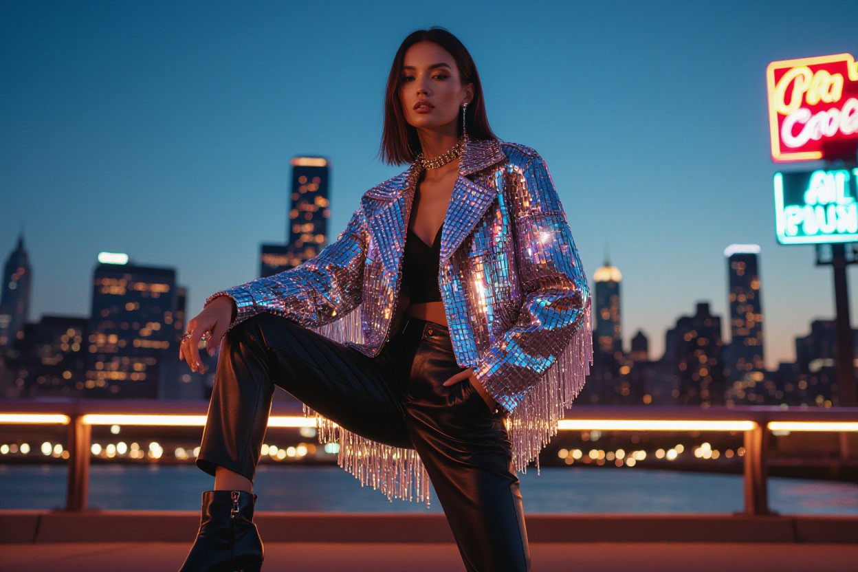 Treat a crystal-fringe coat, skirt, or cape as your outfit’s centerpiece and build up to two complementary layers—slip a silk blouse beneath a fringed camisole or wear a sleeved knit under a fringed mini for warmth and movement. Keep the silhouette streamlined: capes and cropped jackets work with high-waist trousers or pencil skirts to preserve proportion and motion.