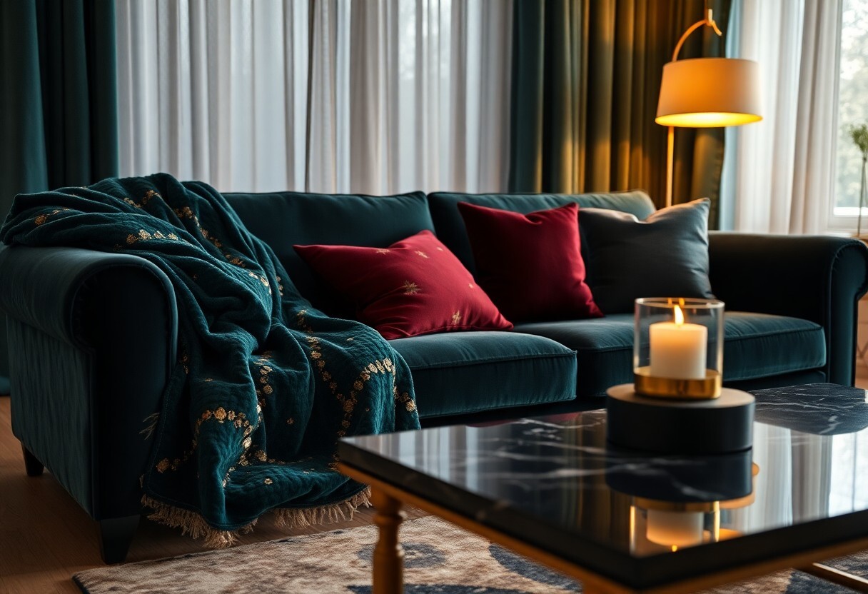 Rather than replacing everything, you should identify focal swaps: swap a glittery throw for a deep velvet cushion, or trade metallic accents for blackened brass or aged bronze. Limit your accent palette to 2-3 colors, and layer 2-3 textures—velvet, nubby wool, matte ceramic—to create richness without clutter. Practical moves include updating curtain panels to floor-length velvet and anchoring seating with a single jewel-toned sofa, which immediately signals direction while keeping flexibility.