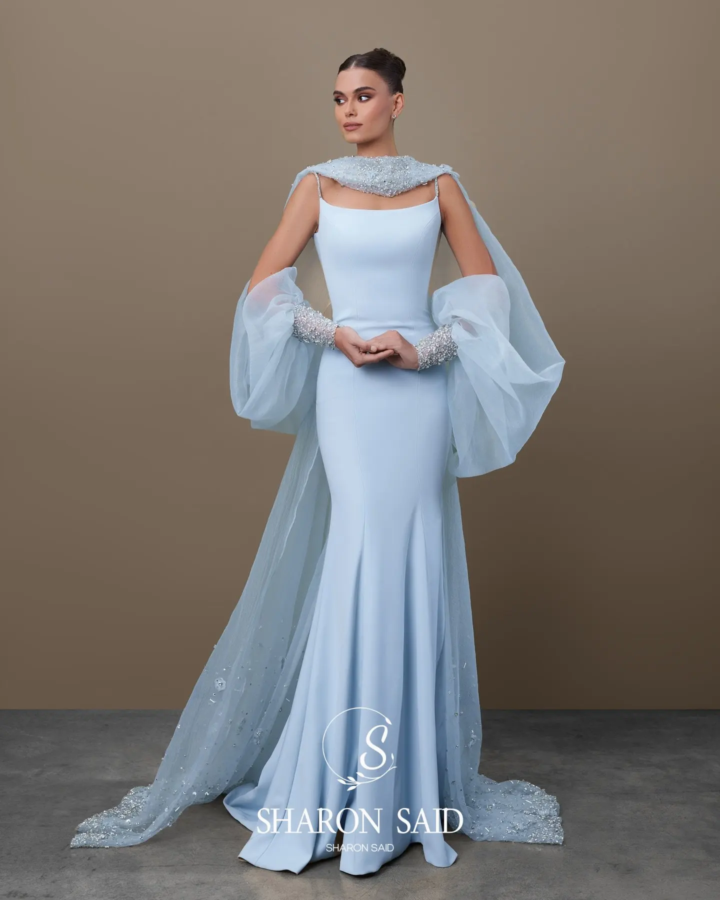 An ethereal embodiment of elegance, the Celestial Tides Gown flows with the serenity and strength of the sea. Designed in a refined mermaid silhouette, this floor-length gown glimmers softly with crystal beading across sumptuous satin, offering a subtle luminescence perfect for formal evenings and black-tie affairs. The full-length sleeves and scoop neckline balance modesty with sophistication, while the structured bodice and built-in bra ensure seamless form and function.