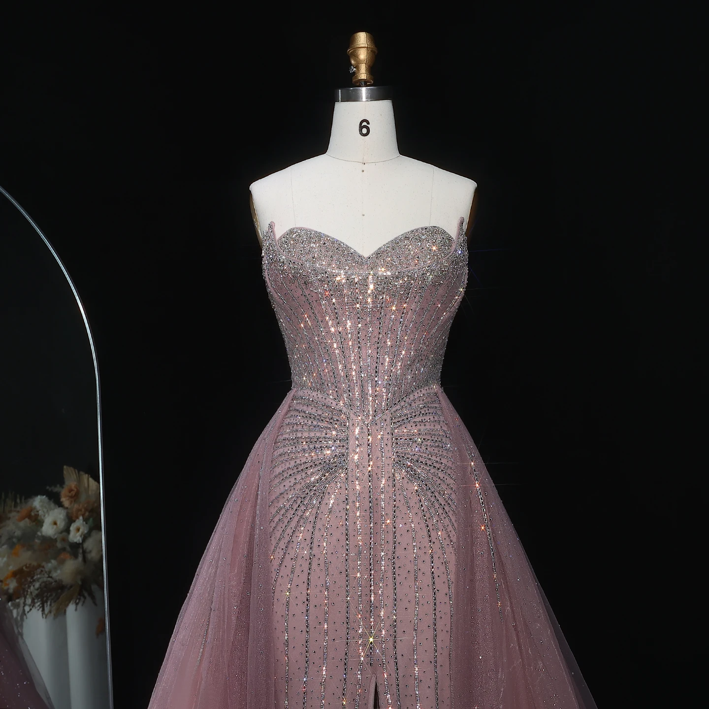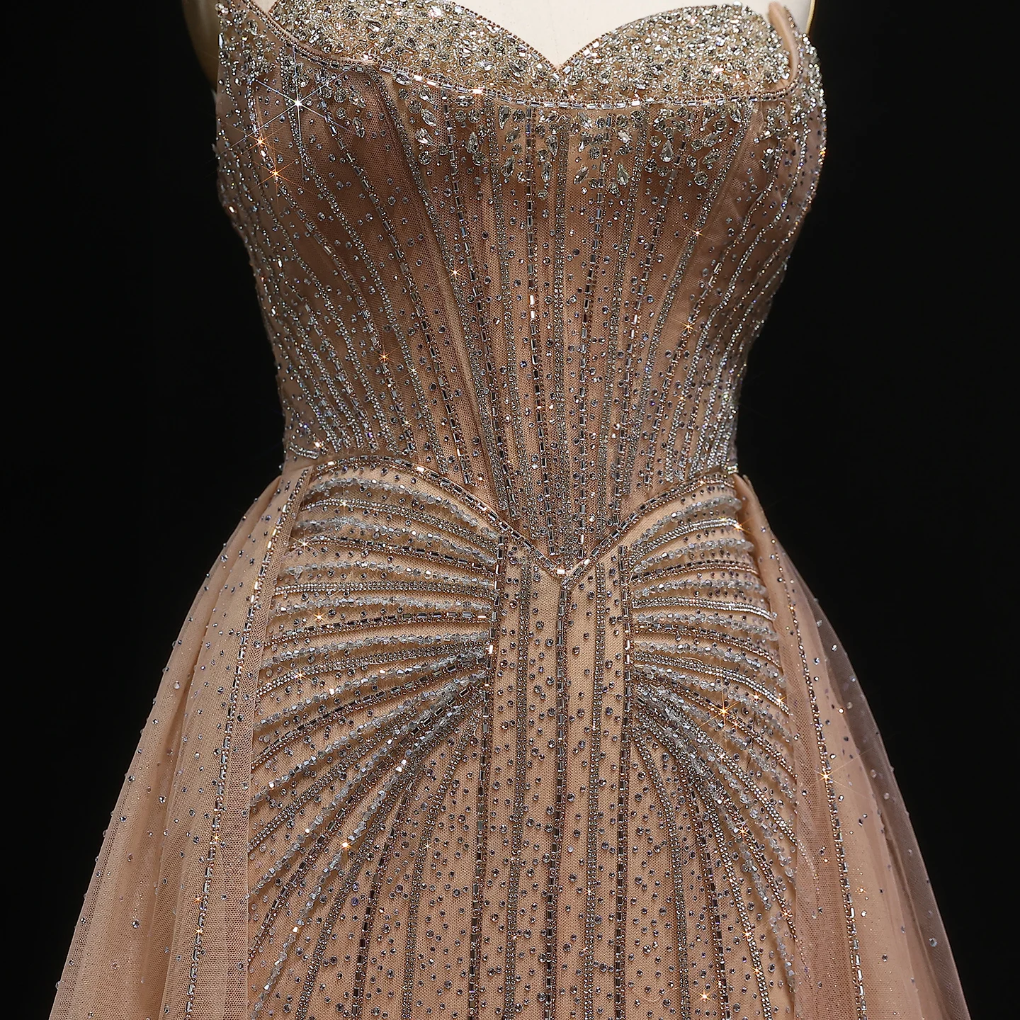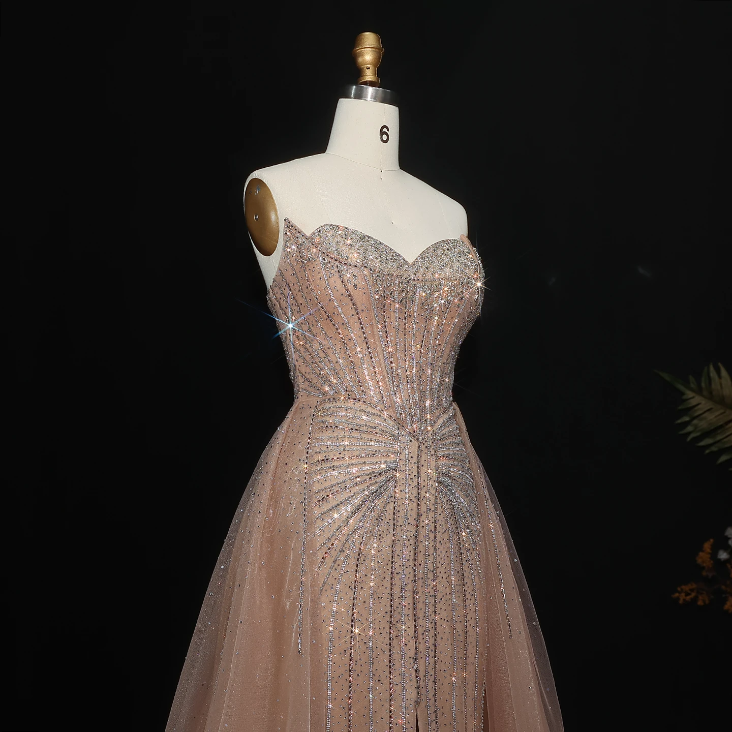 Radiating opulence and celestial charm, the Golden Aura Gown is a show-stopping celebration of luxury and elegance. Handcrafted from layers of soft tulle and drenched in luminous beading, sequins, and crystal embellishments, this sweetheart neckline gown is designed to dazzle under even the softest lighting. The fitted mermaid silhouette hugs the figure before cascading into a dramatic sweep train, capturing light and attention with every step.