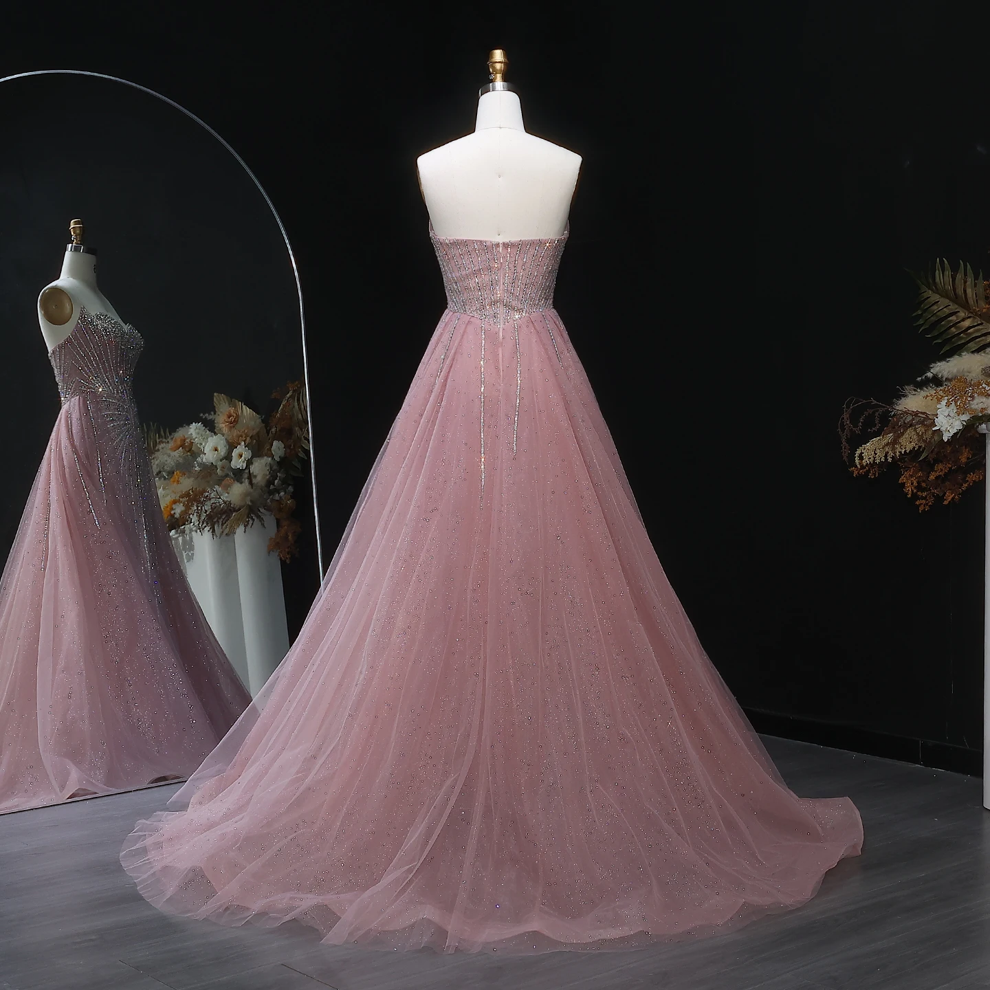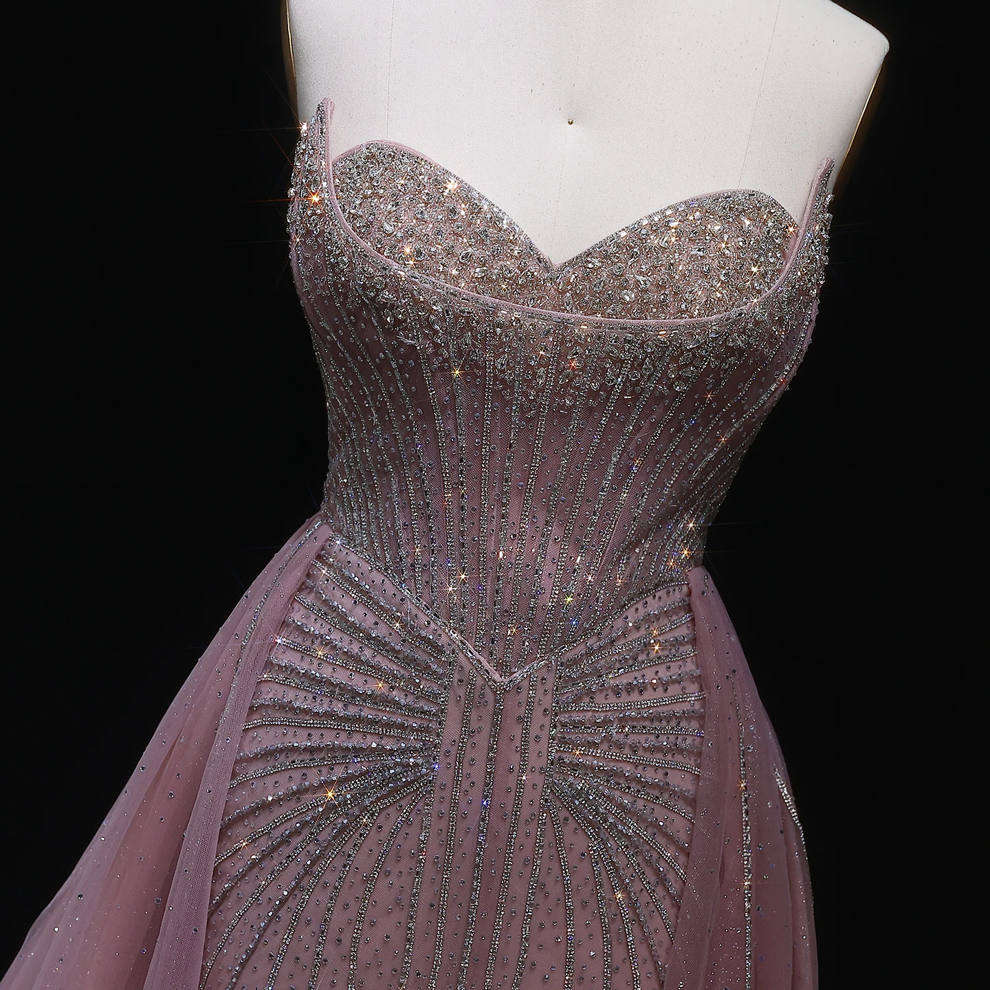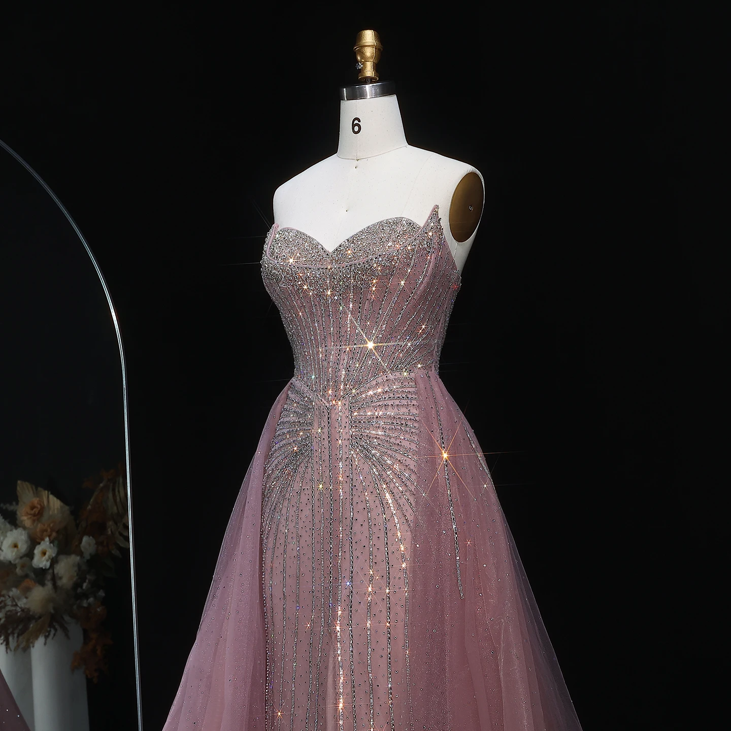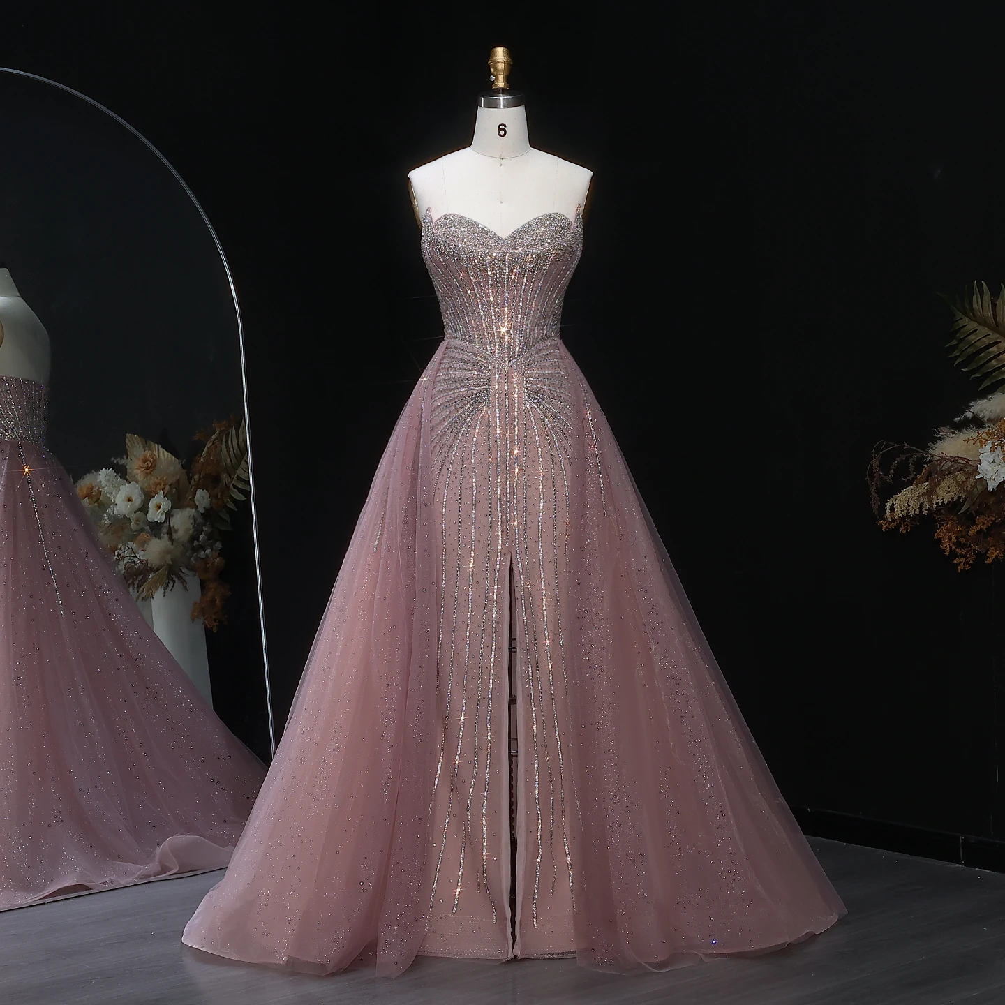 Radiating opulence and celestial charm, the Golden Aura Gown is a show-stopping celebration of luxury and elegance. Handcrafted from layers of soft tulle and drenched in luminous beading, sequins, and crystal embellishments, this sweetheart neckline gown is designed to dazzle under even the softest lighting. The fitted mermaid silhouette hugs the figure before cascading into a dramatic sweep train, capturing light and attention with every step.