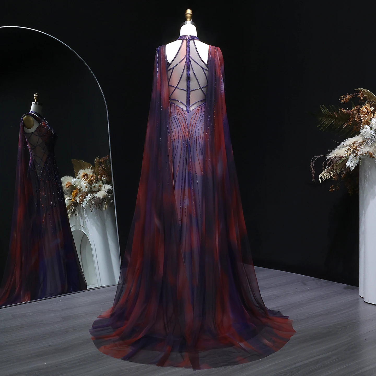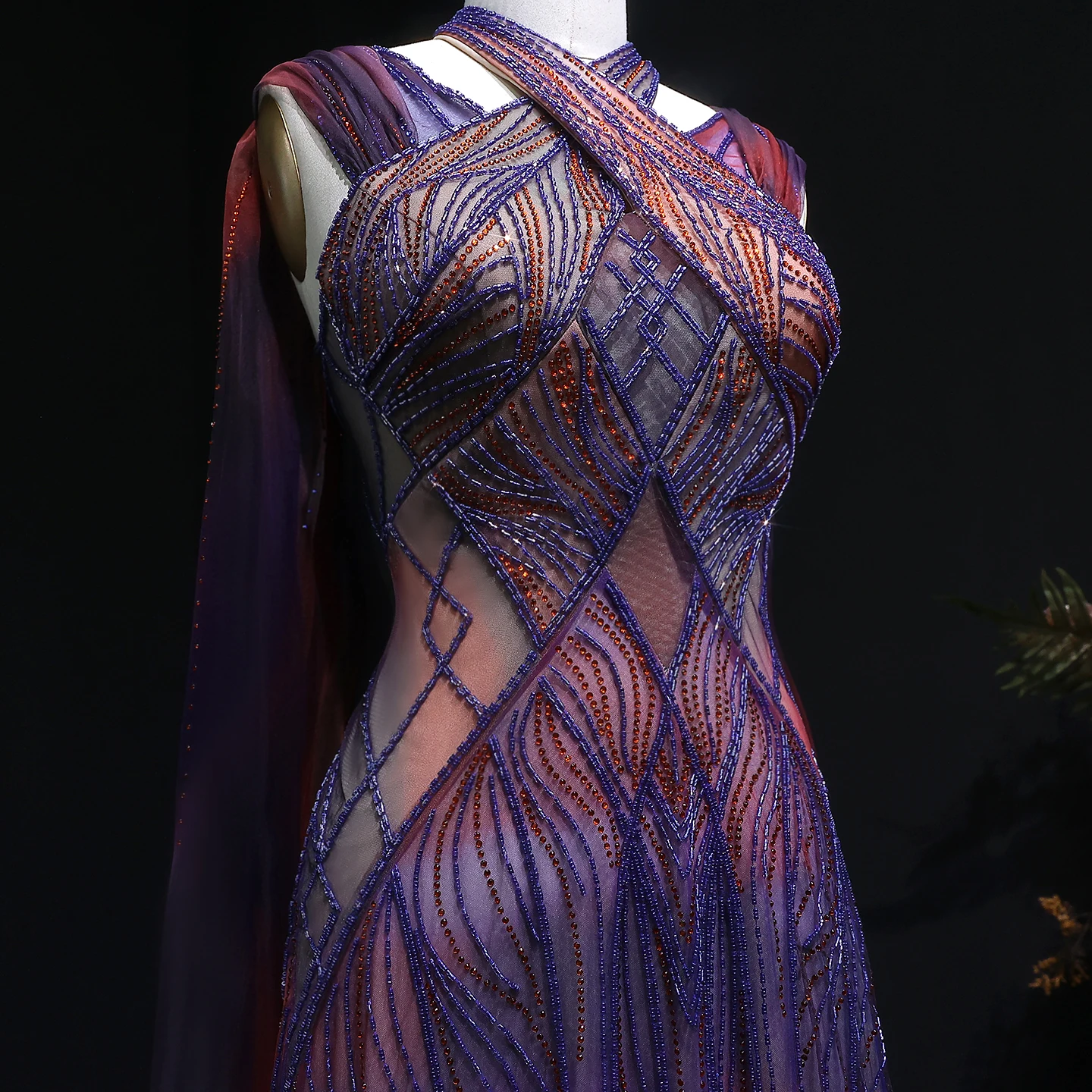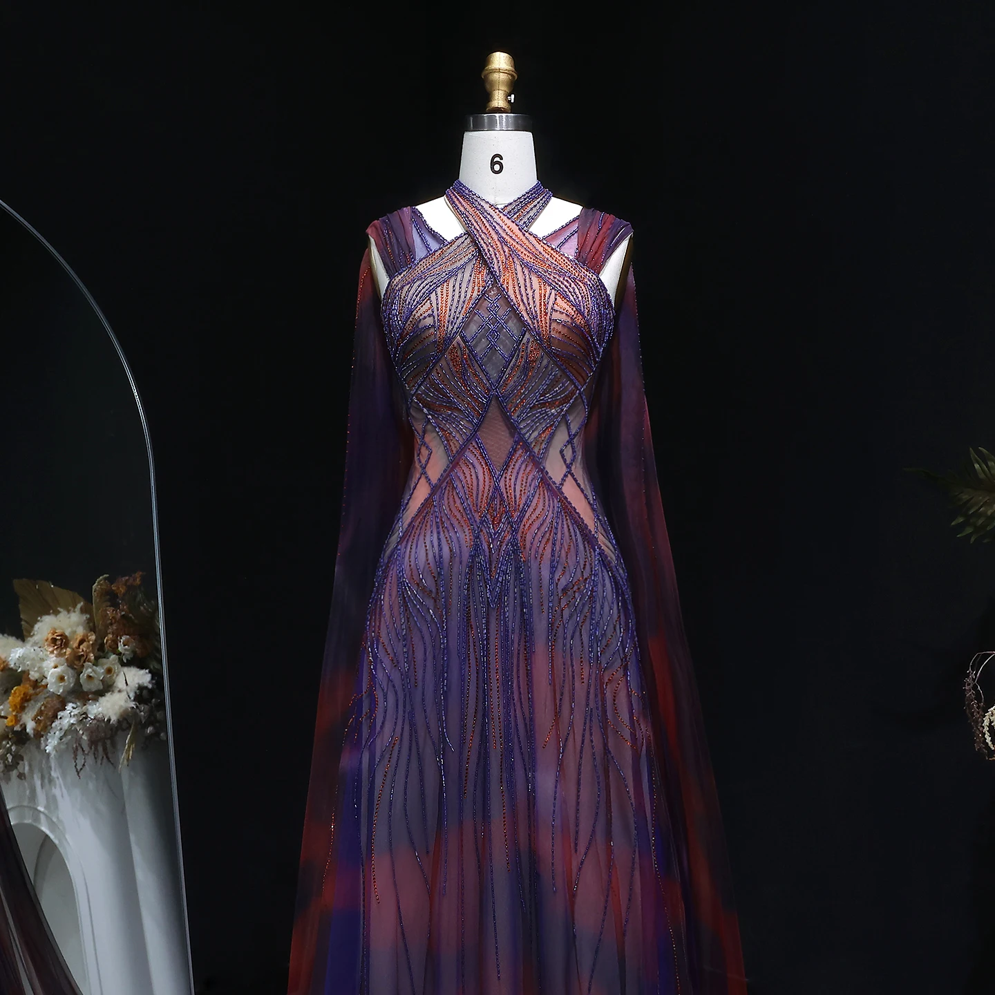 Step into pure regality with the Starlit Empress Gown—a breathtaking expression of elegance, craftsmanship, and celestial drama. This floor-length masterpiece dazzles with intricate beading, a halter neckline, and a sweeping cape sleeve that flows like stardust behind every step. The silhouette is sleek and statuesque, crafted from layers of ethereal tulle that glide effortlessly over the figure, culminating in a gentle sweep train that trails with divine grace.